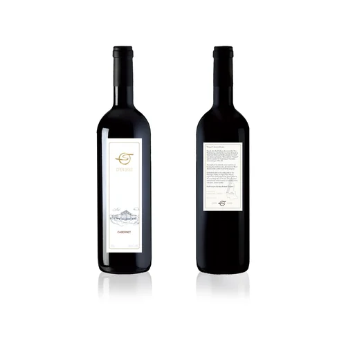 Wine label design, along with logo design and name creation for Open Skies with a hand-drawn image of the vineyard's estate